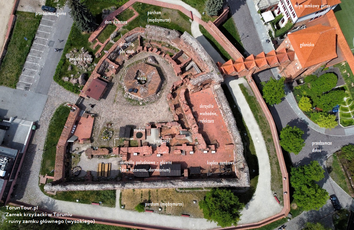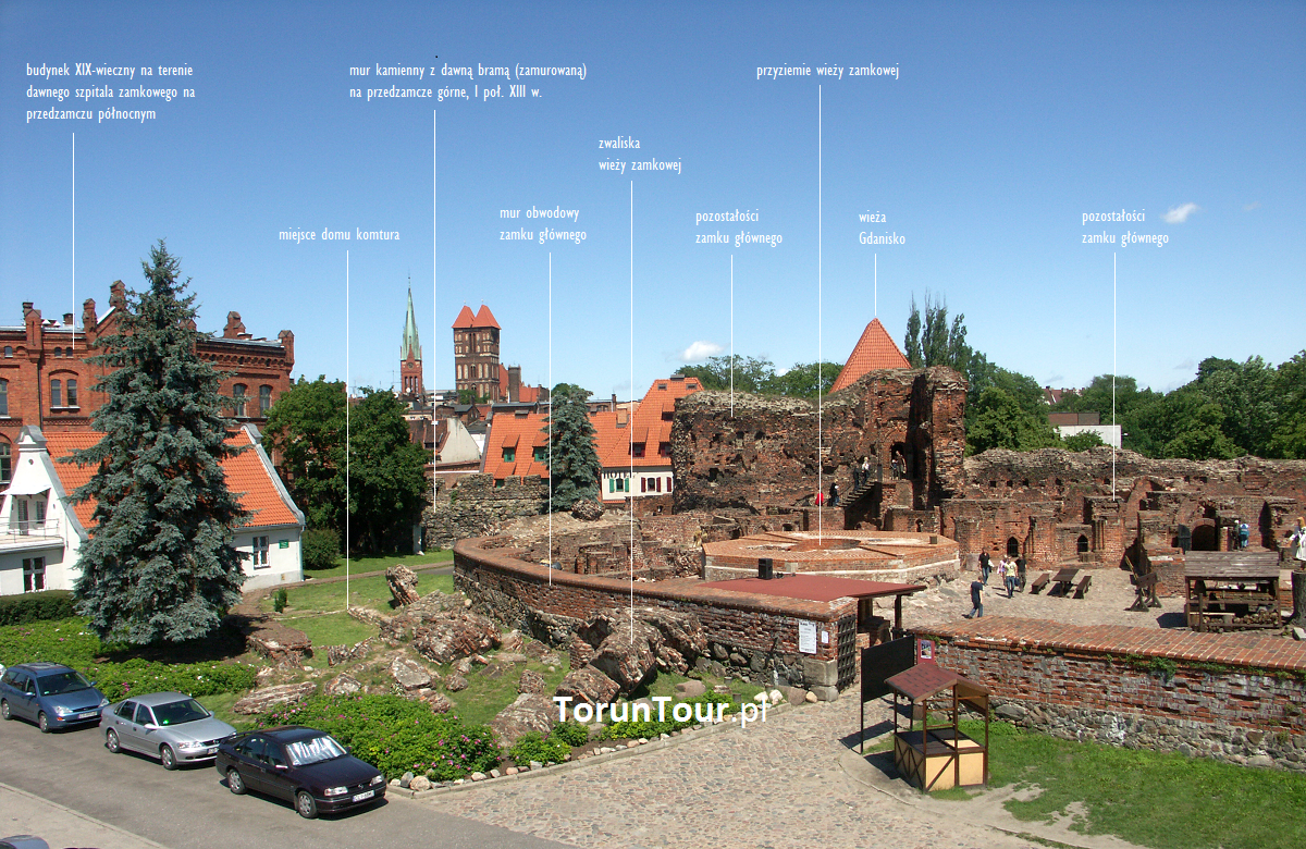 Komturski zamek (zobacz: Komturia toruńska), którego budowę rozpoczęto około 1250 r. (a być może już po 1236 r., tj. po przeniesieniu się Krzyżaków ze Starego Torunia), składał się z zamku głównego, międzymurza (parchamu) i przedzamczy (północnego, górnego i dolnego).