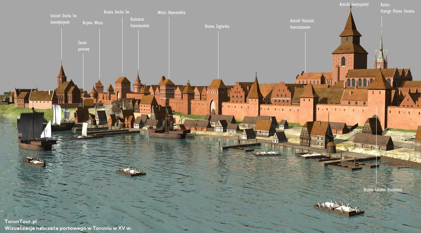 Nad Wisłą, w miejscu dzisiejszego Bulwaru Filadelfijskiego znajdował się port, który w średniowieczu przyjmował statki morskie i miał szczególnie duże znaczenie do czasu, aż w końcu XIV w. roli tej nie przejął Gdańsk. To właśnie nadwiślańskie położenie Torunia gwarantowało sukces tego miasta, które już w XIV w. licząc ok. 20 tys. mieszkańców (>>>) należało do wąskiego grona największych i najbogatszych miast w Europie środkowej, utrzymując tę pozycję aż do rozbiorów (zobacz: Królowa Wisły - Toruń w czasach świetności).
