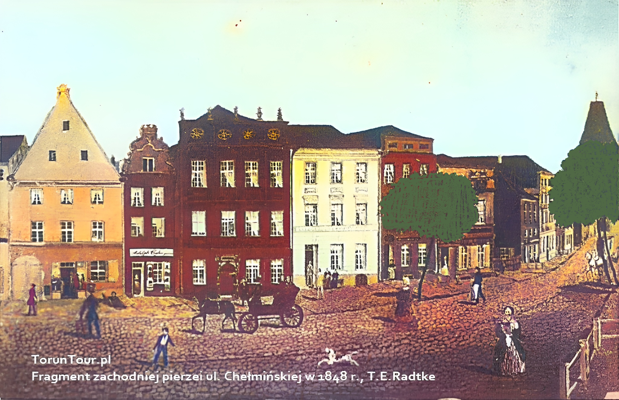 Parcele położone przy ul. Chełmińskiej - podstawowej arterii średniowiecznego i nowożytnego Torunia, biegnącej od przeprawy przez Wisłę na północ - od zawsze były cenne dla mieszczaństwa. Przebieg tej ulicy skłaniał właścicieli do reprezentacyjnego traktowania elewacji położonych tu kamienic. Od lat 30. XIX w. nasila się tu intensywny ruch budowlany, polegający na zmianie układu wnętrz i podziału kamienic na wielomieszkaniowe, co wiązało się ze zmianą elewacji i likwidacją historycznych form stylowych i detali zdobniczych oraz zabudowy oficynowej. Coraz częściej dochodziło do wykupowania działek i tworzenia na dwóch sąsiednich połączonych parcelach jednej dużej kamienicy czynszowej.