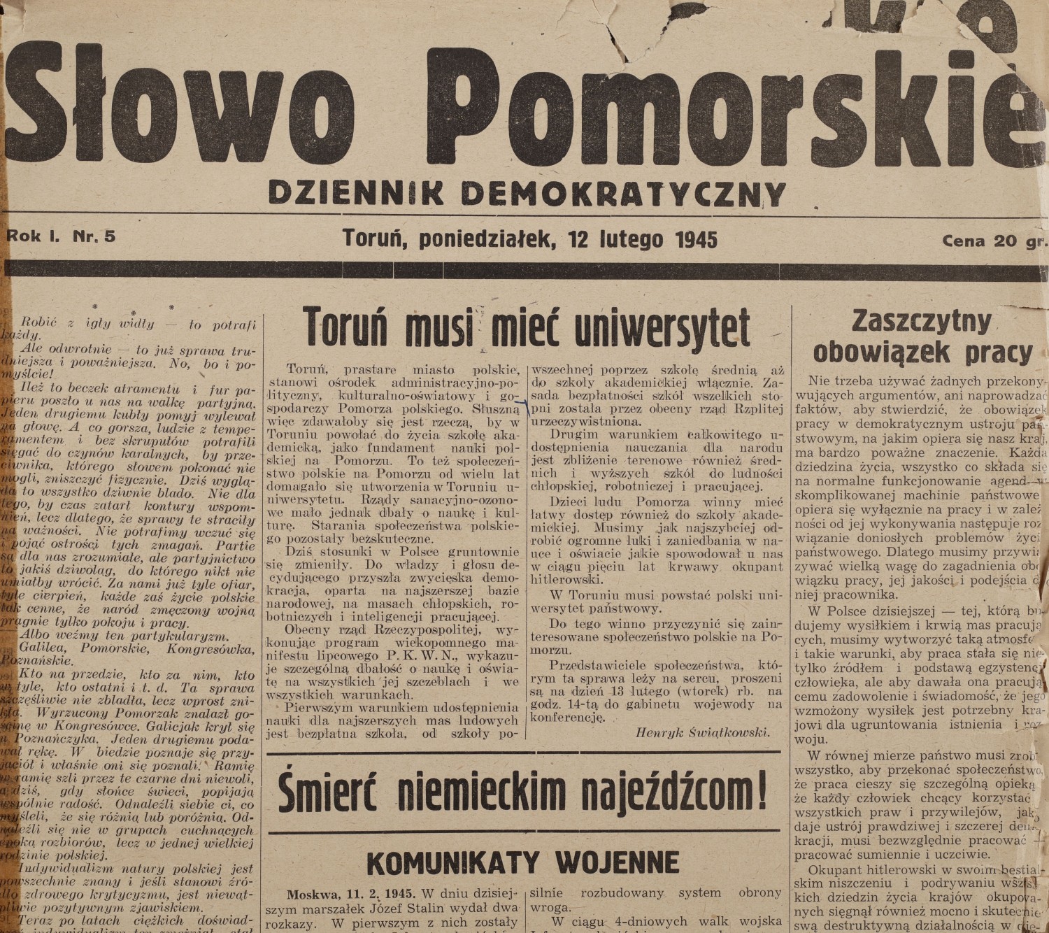 W Toruniu w 1920 r. pierwsze deklaracje utworzenia uniwersytetu wysunęła w listopadzie Narodowa Partia Robotnicza, obierając za patrona uczelni Mikołaja Kopernika.