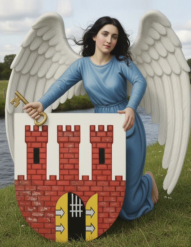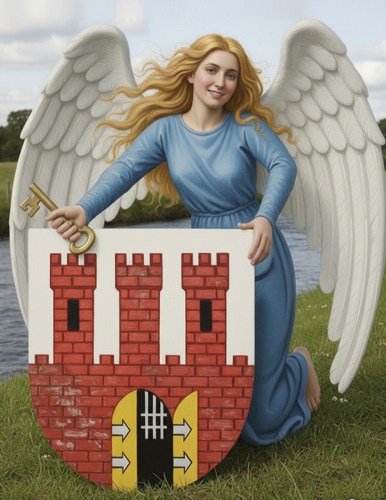 Jakże piękne jest godło sławnego miasta Torunia. Miasto to piękne bez skazy, herbem swym może się szczycić. Obywateli zaś męstwo, silne jak trzy wieżyce, które ramiona anioła garną ku sobie tak ufnie, że serca, mniemać by można, mają te wieże w tym herbie. Ufnie stąd obywatelom przychodzi w mieście przebywać. W jednej połowie otwarte, w drugiej zawarte podwoje, jakaż jest tego przyczyna, zapyta może niejeden. Oto dla wroga srogiego są wrota zamknięte, a druga połowa dla gości stoi otworem.