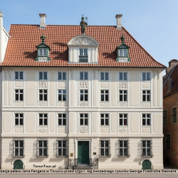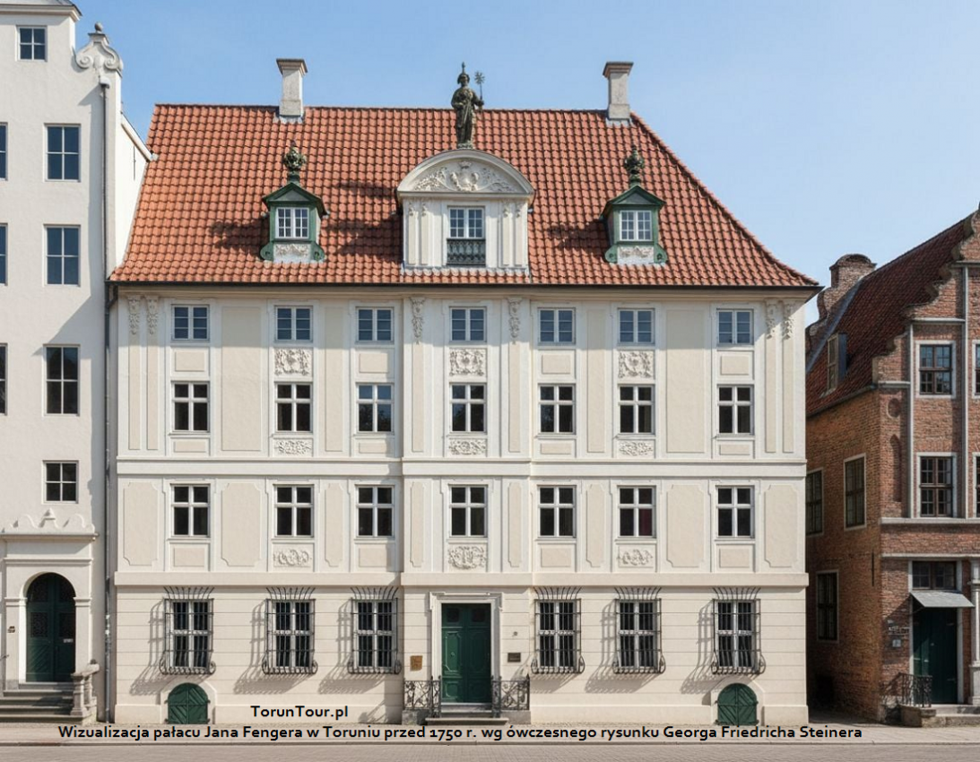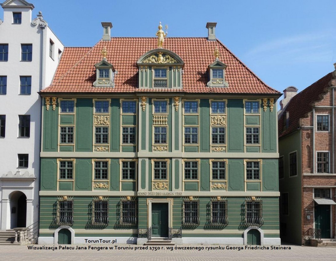 Od 1743 r. właścicielem posesji został bogaty kupiec i bankier Johann Fenger (następnie wdowa po nim i syn Jacob), który przekształcił budynek w reprezentacyjny pałac miejski o bogato zdobionej fasadzie, z głównym wejściem na jej osi. Parter i 1. piętro miały funkcje mieszkalne i reprezentacyjne, dwie wyższe kondygnacje - magazynowe. Pałac miał bogato zdobioną 7-osiową fasadę z jednoosiowym ryzalitem pośrodku, w którego dolnej części znajdowały się reprezentacyjne drzwi poprzedzone przedprożem z kutą ozdobnie balustradą. Nad drzwiami umieszczpny był napis "ANNO / SOLI DEO GLORIA / 1742" w tłumaczeniu "Tylko Bogu chwała". Jest to odniesienie do ideologii protestanckiej (luterańskiej), która odrzuca katolicki kult świętych (Fengerowie, podobnie jak XVIII-wieczny Toruń bylu wyznania protestanckiego).