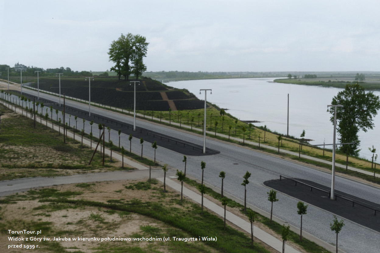 Fotografia po lewej: niwelacja Góry św. Jakuba podczas przygotowań do budowy ul. Traugutta, lata 30. XX w. Fotografia po prawej: widok w 2016 r. w kierunku zachodnim