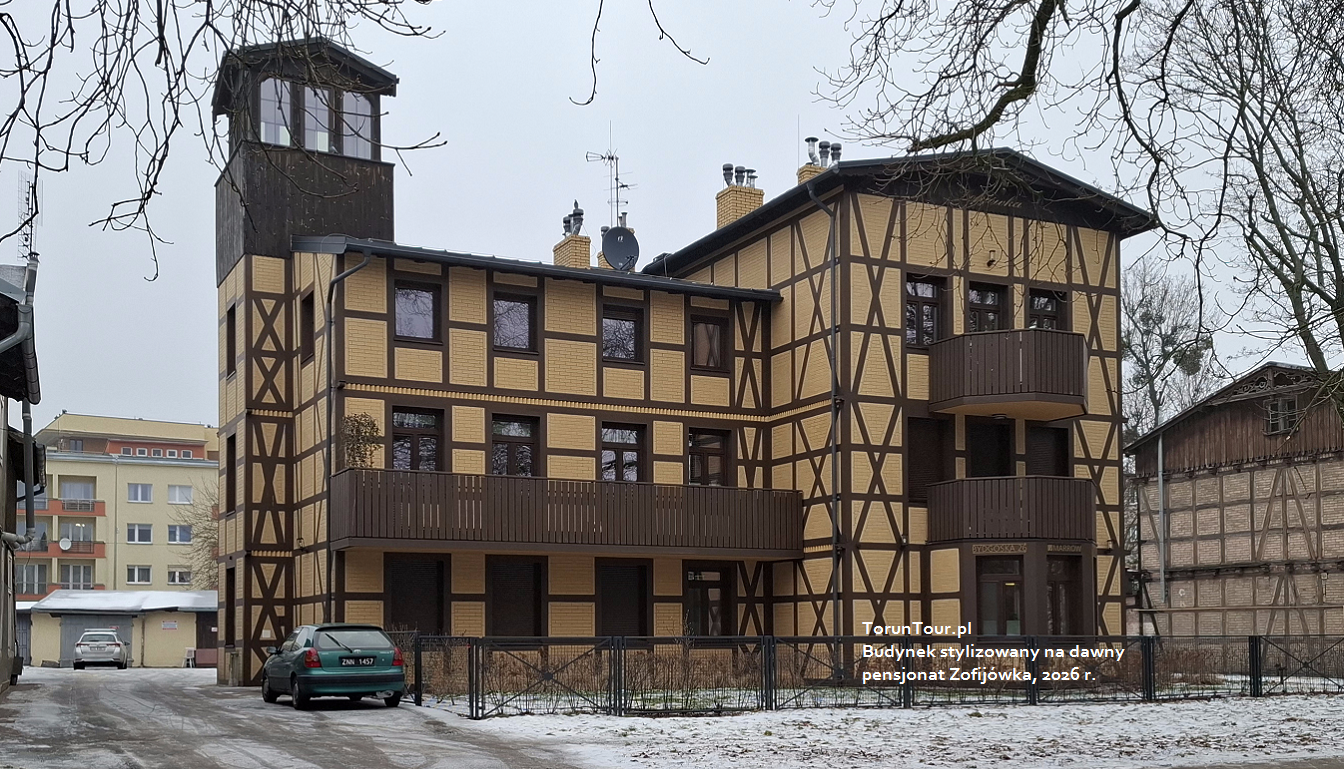 Kamienica z 1876 r. przy ul. Bydgoskiej 26 na Bydgoskim Przedmieściu w Toruniu od momentu tragicznego pożaru jesienią 2013 r. stała w niszczejącej ruinie do 2019 r., kiedy to została rozebrana i odtworzona na podobieństwo oryginału, różniąc się jednak wieloma elementami i szczegółami od niego i mieszcząc aż 12 lokali mieszkaniowych >>>Zbudował ją Alfred Pastor, właściciel tartaku. Na pocz. XX w. właścicielem był Bruno Franke, prowadzący tu drukarnię i oferujący mieszkania nawynajem. Wtedy dom nazywano Villa Franke.