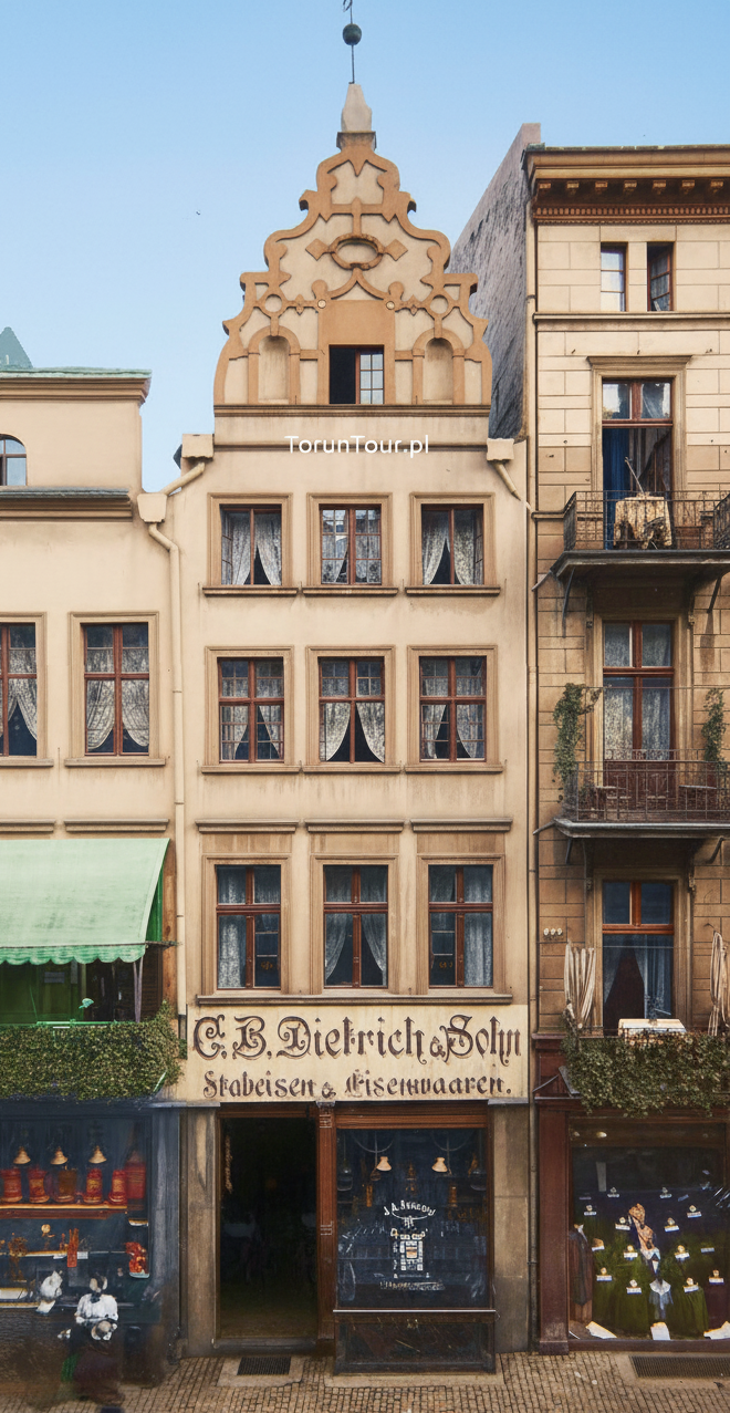 Obecny secesyjno-modernistyczny dom handlowy został zbudowany ok. 1913 r. przez spółkę handlową "Dietrich & Sohn" zajmującą się artykułami żelaznymi, na miejscu rozebranych dwóch zabytkowych patrycjuszowskich kamienic gotycko-renesansowych.Jedna z nich przed rozbiórką była charakterystyczną dla Torunia i bogatych miast północnoeuropejskich smukłą kamienicą patrycjuszowską, trójosiową z wysokim szczytem manierystycznym o charakterystycznym zdobnictwie okuciowym oraz wszystkimi unikatowymi elemetami wnętrza, jak wysoka sień, trakt przedni i tylny i in. Do dziś zachowały się gotyckie podziemia, w których ulokował się Dom legend Toruńskich.