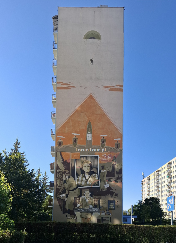 Upamiętnia Honorową Obywatelkę Torunia, legendarną kurierkę AK, jedyną kobietę wśród elitarnej grupy Cichociemnych, gen. Elżbietę Zawacką "Zo" (1909-2009), która do swej śmierci mieszkała w budynku ozdobionym tym malowidłem.