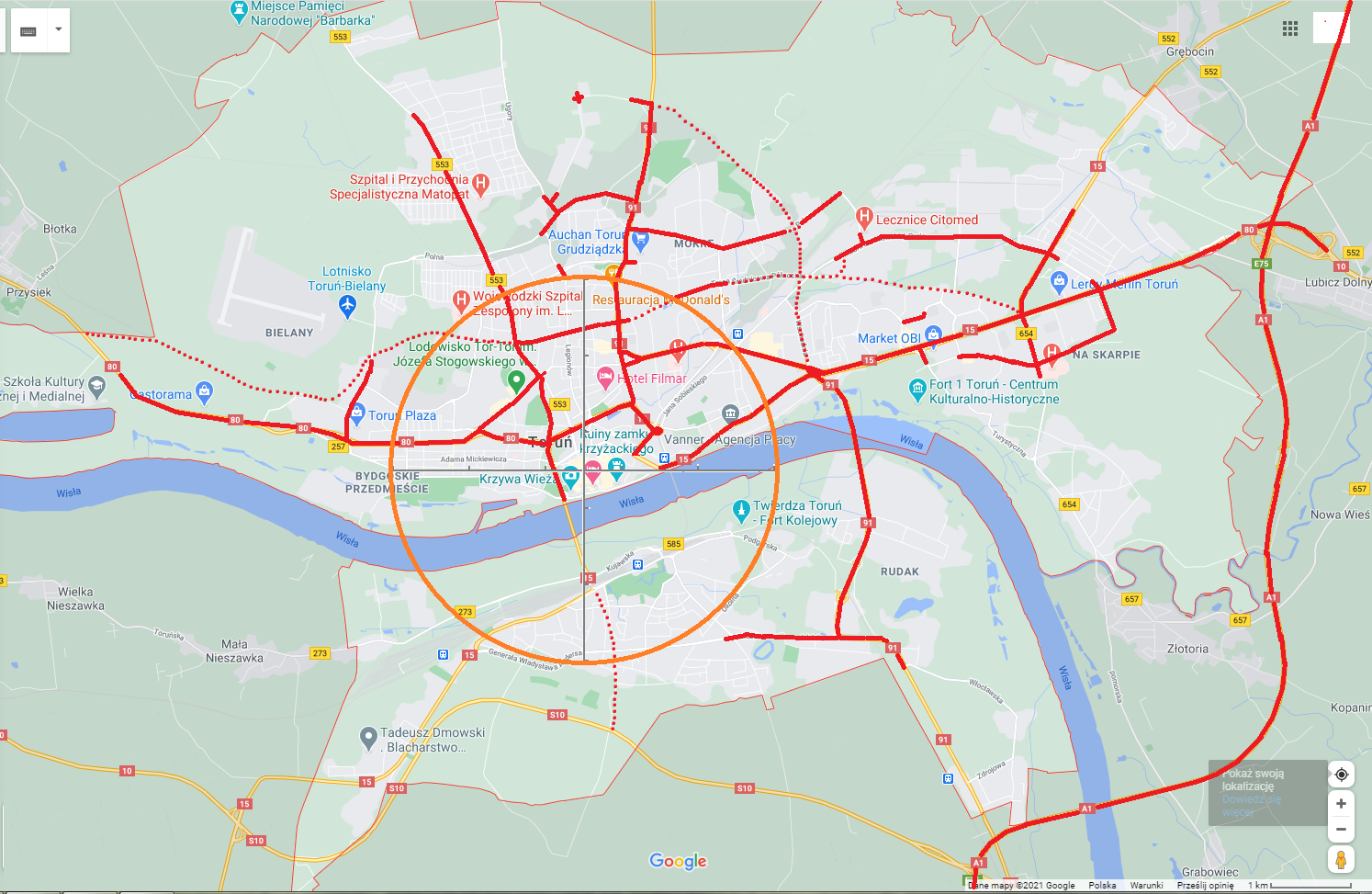 koło pomarańczowe - centralny obszar miast o średnicy 5 km