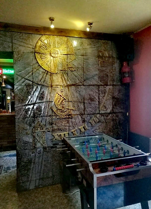 Bar „Pod Kotwicą”, ze względu na wyjątkową kompozycję ceramiczną, należał do najlepiej urządzonych lokali gastronomicznych w Toruniu lat 70. Projektantem wnętrza „Kotwicy” był Lech Popielewski. W gospodzie przy Łaziennej Popielewski rozdzielił dwie sale ścianą, z obu stron pokrytą ceramicznymi płytami. Utrzymana w tonacji błękitów, fakturalna kompozycja o motywach marynistycznych, odnosiła się do przedwojennej tradycji tego lokalu. Za projekt wnętrza odpowiadał Popielewski, witraże w oknach były dziełem Edwarda Kwiatkowskiego. Nie została potwierdzona atrybucja ceramicznej okładziny, być może jej autorką była Maria Hoffmann, znana toruńska ceramiczka, projektantka naczyń w Spółdzielni Rzut, prywatnie małżonka Popielewskiego. Takich wnętrz, nad którymi pod okiem jednego projektanta pracował cały zespół wybitnych plastyków, i gdzie każdy element został przemyślany i zaprojektowany jako element większej całości pozostało dziś niewiele. W Toruniu, w którym wnętrza powstałe w drugiej połowie XX wieku miały szczególnego pecha do właścicieli i włodarzy, lokale takie jak "Pod Kotwicą" są wyjątkowo cenne.