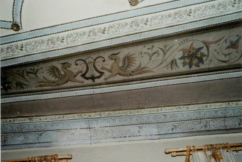 Dekorację plafonu tworzą polichromowane i złocone stiuki roślinne i geometryczne, między którymi malowidła (m.in. przedstawienie heraldyczne, ptaki, ornamenty roślinne):