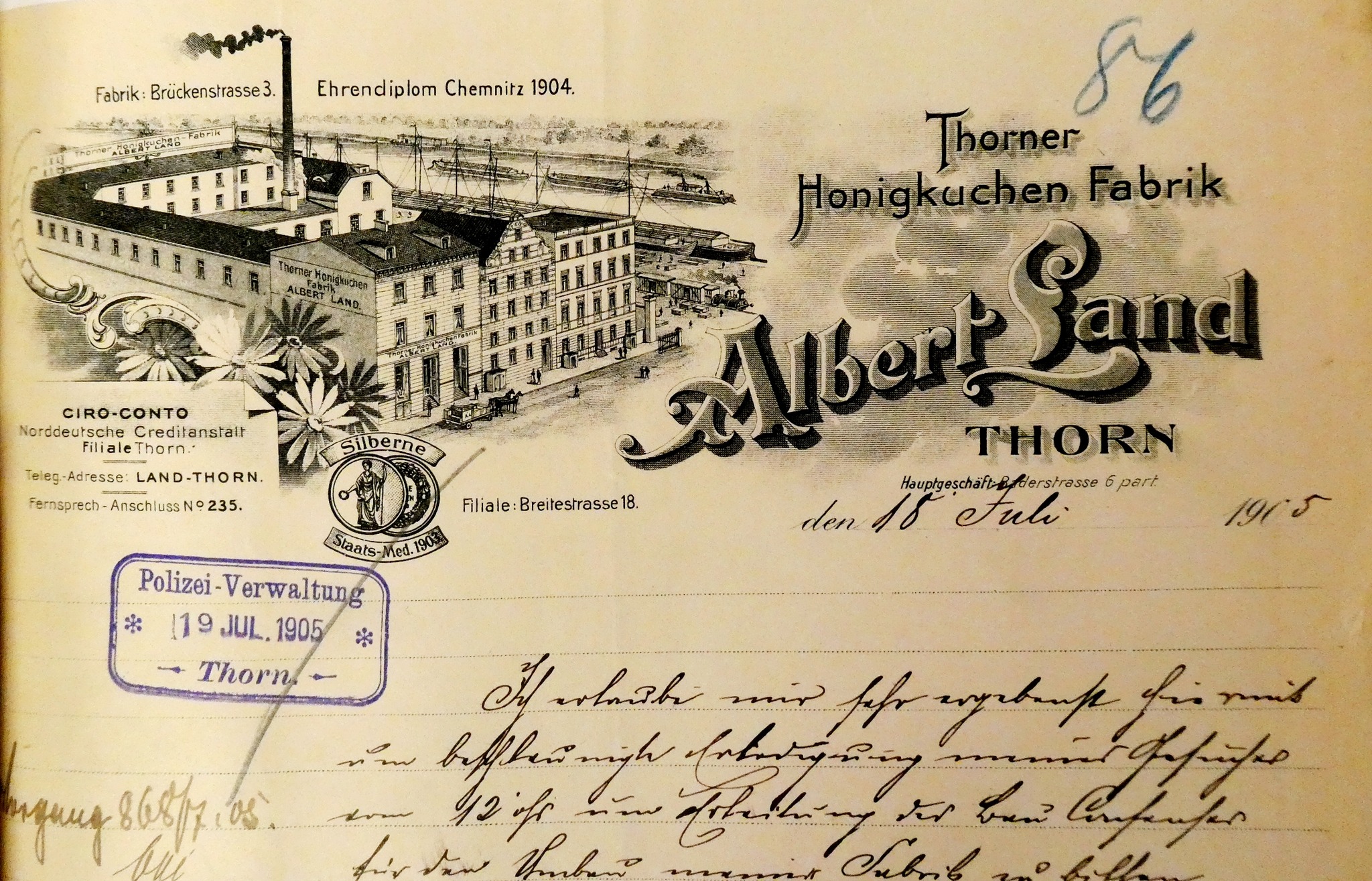 Na pocz. XX w. - w latach 1902-1908 - działała tu (konkretnie w dawnym spichrzu przy ul. Mostowej) jedna z wytwórni pierników toruńskich. Jej właścicielem był Albert Land, który był piernikarzem pochodzącym ze Śląska. W swojej ofercie miał oczywiście katarzynki - najbardziej toruńskie z toruńskich pierników, także brukowce i inne pierniki.