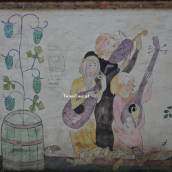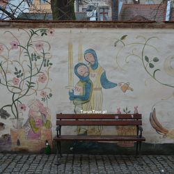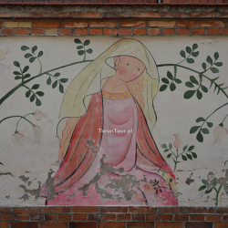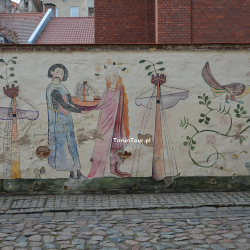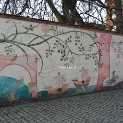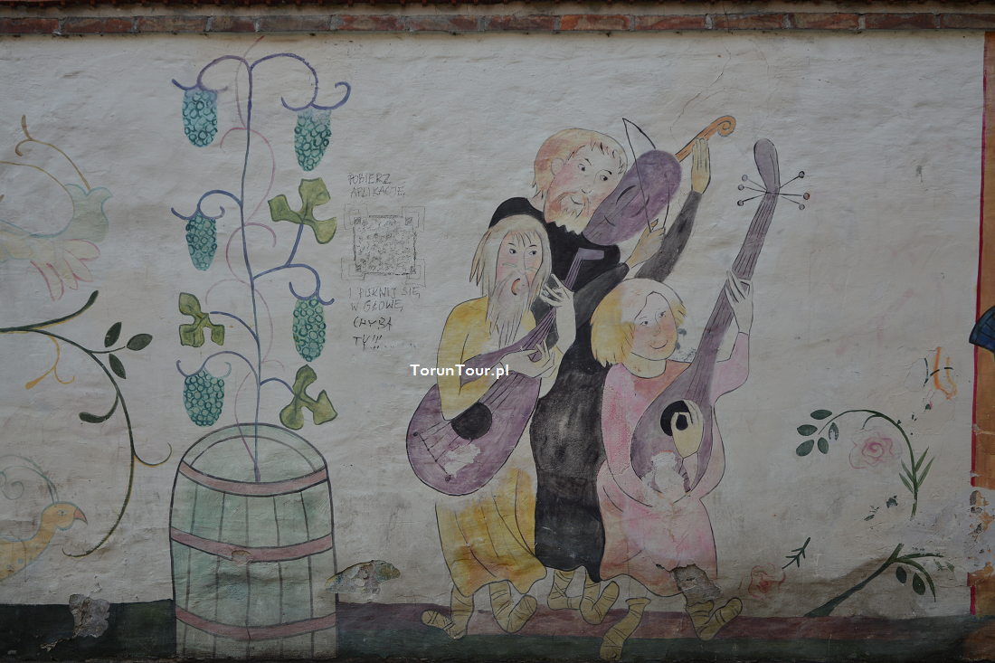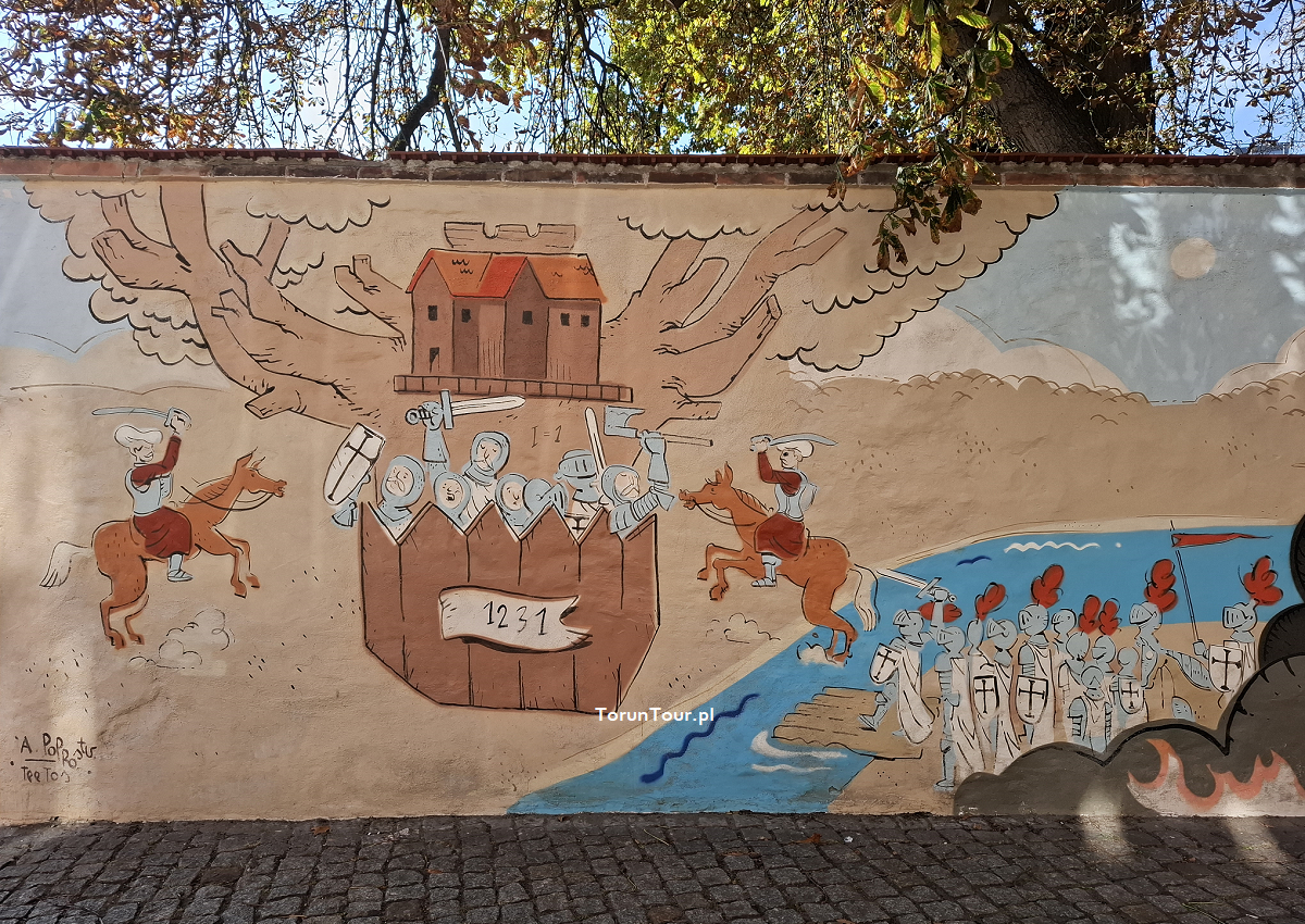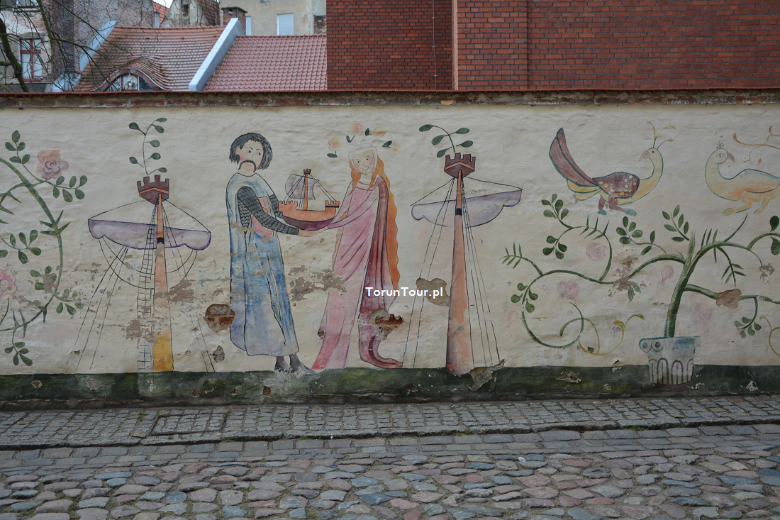 Mural autorstwa Iwony Liegmann powstał na zlecenie Urzędu Miasta w 2010 r. Na murze ogrodzeniowym domu dawnego Bractwa Kurkowego przy ul. Przedzamcze 11/15 na Starym Mieście przedstawiono scenki odnoszące się do średniowiecznego Torunia. Mamy więc wieże miejskie (w jednej z nich romantycznie-bajeczny motyw uwięzionej księżniczki), rycerzy, powabne mieszczki, muzykantów, przy stole biesiaduje dwójka rycerzy, gdzie indziej Wisłą płyną kupieckie statki do portu toruńskiego, dalej św. Jerzy walczy ze smokiem. Wszystko to scalają wici roślinne, zioła i róże oraz pojawiająca się tu i ówdzie winna latorośl.