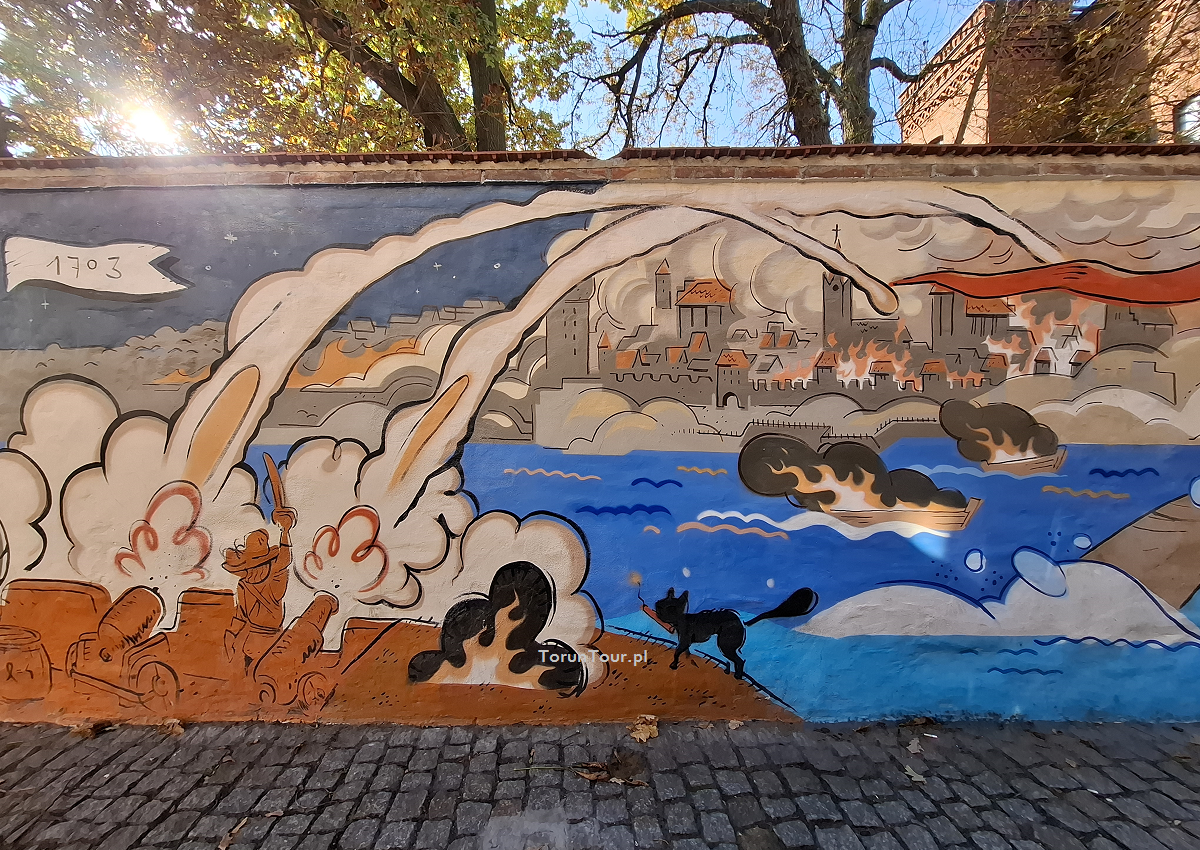 Inspiracją dla tej sceny na muralu był rysunek Georga Friedricha Steinera zatytułowany "Bombardowanie Torunia przez wojska szwedzkie w 1703 r." Szwedzi, bombardując miasto, skupili się nie tyle na fortyfikacjach, ile na zabudowie miejskiej, mając nadzieję na szybkie przełamanie oporu obrońców. Ostrzał rozpoczął się 24 września i w krótkim czasie spowodował ogromne zniszczenia.