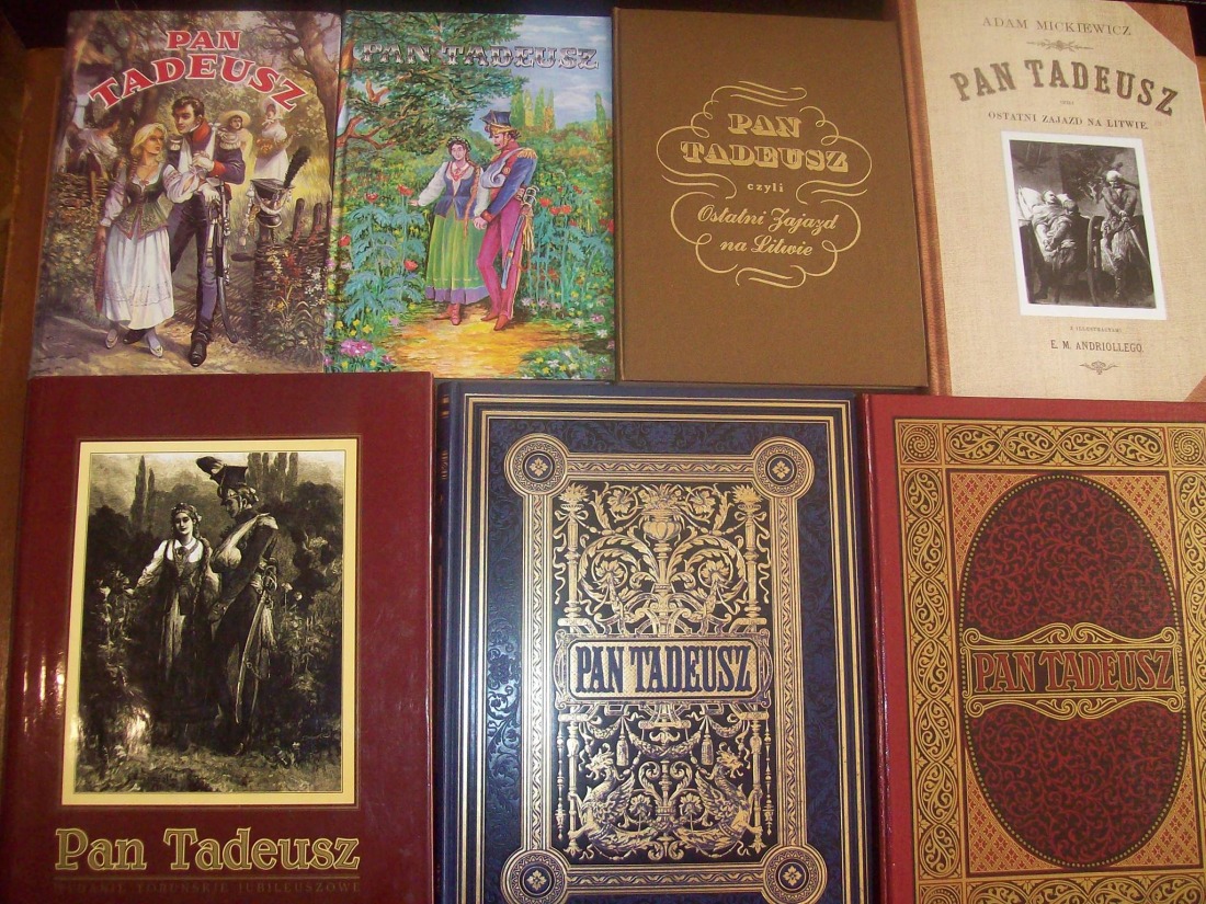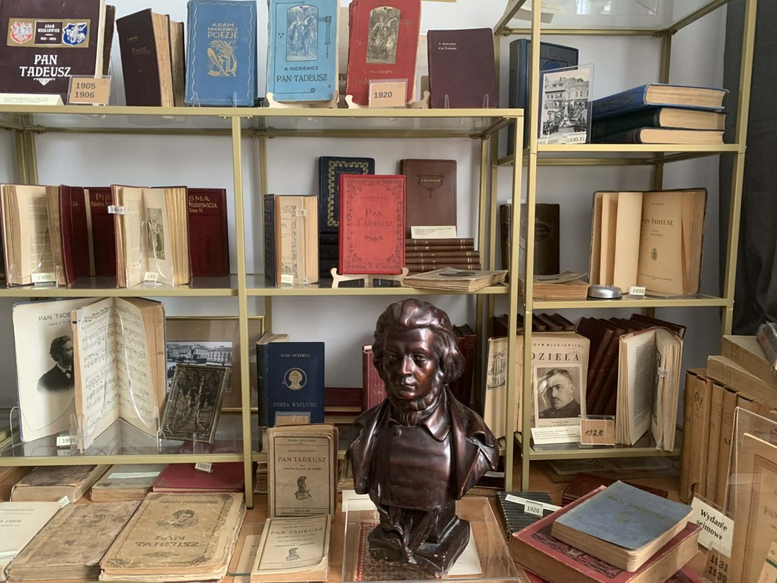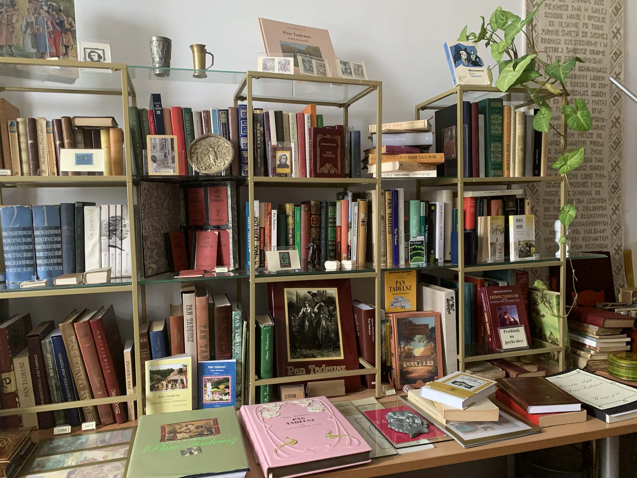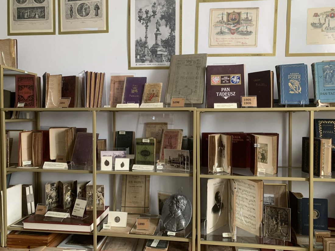 Pokazujemy ponad 300 wydań epopei narodowej, począwszy od połowy XIX w. oraz prawie drugie tyle wydawnictw o „Panu Tadeuszu” i okolicznościowych mickiewiczowskich pamiątek. Spotkacie tu wydania samodzielne i zbiorowe, skromnie i bogato ilustrowane, w pięknych oprawach, maleńkie i ogromne księgi, edycje okolicznościowe, jubileuszowe, ludowe, sejmowe, narodowe. Przeczytacie Inwokację na kilimie i miarce aptecznej oraz tłoczoną w języku Braille’a. Zobaczycie wydania w tłumaczeniu na języki obce i posłuchacie jak brzmią fragmenty po chorwacku czy chińsku. Mamy też zbiór multimediów oraz nagrania recytacji osoby znającej na pamięć cała epopeję. Są też programy oraz plakaty teatralne i filmowe. Jest unikatowy portret Adama Mickiewicza oraz pocztówki z pomnikami Wieszcza. Są znaczki pocztowe, pamiątkowe medale, statuetki. Są też nasze opowieści, w których przypominamy ludzi, którzy te piękne historyczne wydania tworzyli: wydawców, drukarzy, księgarzy, ilustratorów, introligatorów, pomysłodawców, autorów opracowań. Pokazujemy też ciekawe znaki proweniencyjne, przekazujemy dalej przekazane nam świadectwa znaczenia epopei w życiu różnych osób. Każdą książkę można u nas poznać z bliska, zajrzeć do środka oraz czytać. Można posłuchać nagrań na winylach lub płytach CD w wykonaniu znanych aktorów. Kolekcji głównej towarzyszą inne powiązane tematycznie. Jest ciekawy zbiór wydań „Ballad i Romansów”, zbiór książek, innych materiałów i ciekawych opowieści regionalnych związanych z „Panem Tadeuszem” i Adamem Mickiewiczem. Jest też opowieść „Jak to się zaczęło”. Organizujemy cykliczne spotkania „Wokół jednej książki”, „Pan Tadeusz na językach”, „Pan Tadeusz na pamięć”. Kolekcja cały czas się rozwija a nowe eksponaty prezentujemy w mediach społecznościowych. |